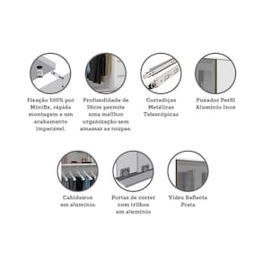 Guarda Roupa 2 Portas de Correr 3 Gavetas 159cm com Vidro Reflecta Prata Prime Luciane Móveis