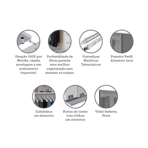 Guarda Roupa 2 Portas de Correr 3 Gavetas 159cm com Vidro Reflecta Prata Prime Luciane Móveis