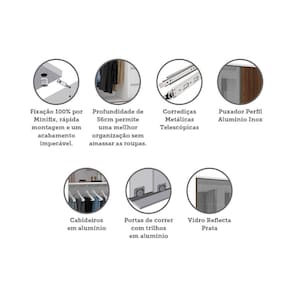 Guarda Roupa 2 Portas de Correr 3 Gavetas 159cm com Vidro Reflecta Prata Prime Luciane Móveis