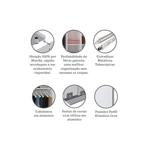 O Guarda Roupa Modulado Prime foi desenvolvido se adequando a vários espaços, de grandes a pequenos. Possui 236 cm de altura oferece divisórias para atender diversas necessidades, profundidade de 56cm possibilitando acomodar roupas sem amassar. Produzido em MDP de 15mm, duas portas de correr com trilhos em alumínio, corrediças telescópicas, a montagem é inteira por minifix que proporciona um acabamento impecável e fundos embutidos com perfil usinado para melhor acabamento e maior resistência.
