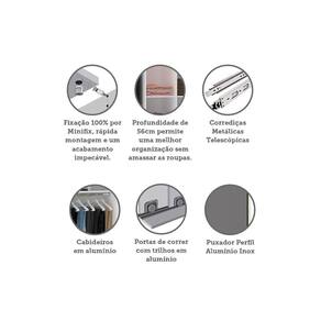 O Guarda Roupa Modulado Prime foi desenvolvido se adequando a vários espaços, de grandes a pequenos. Possui 236 cm de altura oferece divisórias para atender diversas necessidades, profundidade de 56cm possibilitando acomodar roupas sem amassar. Produzido em MDP de 15mm, duas portas de correr com trilhos em alumínio, corrediças telescópicas, a montagem é inteira por minifix que proporciona um acabamento impecável e fundos embutidos com perfil usinado para melhor acabamento e maior resistência.