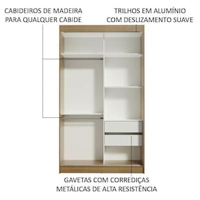 Internamente, contempla duas gavetas com corrediças metálicas, diversas prateleiras e nichos, além de dois cabideiros de madeira com espaço para roupas longas e curtas. A profundidade maior é um grande diferencial.