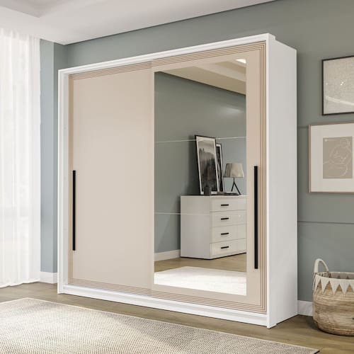 O guarda-roupa 2 portas de correr 2 gavetas da linha Valência, da Politorno Móveis, alia design moderno, elegante e funcional. Com 200 cm de altura, 180,1 cm de largura e 44,5 cm de profundidade, é ideal para otimizar o espaço de maneira eficiente. As portas de correr facilitam o uso em ambientes menores, enquanto as gavetas com corrediças telescópicas garantem um deslizamento suave. Fabricado em MDP/MDF, com acabamento em pintura UV e FF, oferece alta resistência e durabilidade. O espelho embutido agrega sofisticação e amplia o ambiente, e seus puxadores externos e detalhes usinados completam o visual, tornando-o perfeito para um quarto funcional e elegante. Acabamento da Prateleira: Pintura UV Escala de Brilho da Prateleira: Semi-Fosco Acabamento da Gaveta: Pintura UV Escala de Brilho da Gaveta: Semi-Fosco Material do Puxador da Gaveta: MDF Possui Organizador de Gaveta: Não Acabamento da Porta: Pintura UV Escala de Brilho da Porta: Semi-Fosco Material do Puxador da Porta: MDF Acabamento dos Pés: Finish Foil Altura do Espelho: 143 cm Altura dos Pés: 0,37 cm Altura Máxima dos Pés: 0.3700 Ambiente Principal: Quarto codigo_ean: 7900288117571 Complexidade da Montagem: Média: pode ser montado por mais de uma pessoa e/ou necessite de maior conhecimento para montagem Cor: Branco/Creme Cor do Produto: Branco/Creme Cor do Puxador: Preto Cor Interna: Branco Escala de Brilho: Semi-Fosco Espessura da Estrutura (mm): 15 mm Espessura das Portas (mm): 15 mm Espessura das Prateleiras (mm): 15 mm Espessura do Espelho: 3 mm Espessura do Fundo (mm): 3 mm Espessura do Fundo das Gavetas (mm): 3 mm Fita Integrada: Sim Formato do Espelho: Retangular Gaveta com Chave: Não Itens Inclusos: 1 Guarda-Roupa, Manual de Montagem e Kit Ferragens Largura do Espelho: 56 cm Linha ou Coleção: Valência Manual de Montagem e Instalação: https://product-hub-prd.madeiramadeira.com.br/984455/documents/3cfe169a-54f9-4bc7-9599-257d63188d432806618622417440508560076.pdf Marca: Politorno Material da Gaveta: MDF/MDP Material da Porta: MDF/MDP Material da Prateleira: MDF/MDP Material dos Pés: MDF Material Principal: MDF/MDP modular: Não Necessita Montagem: Sim Origem do Produto: Nacional Peso: 81,34 kg Peso Máximo por Gaveta: 5 kg Peso Máximo por Prateleira: 10 kg Possui Calceiros: Não Possui Espelho: Sim Possui Pés: Rodapé Possui Portas: Sim Possui Prateleiras: Sim Produto Montado: Sim Quantidade de Espelho: 03 Espelhos com Tamanhos Iguais Quantidade de Gavetas: 02 Gavetas Quantidade de Portas com Espelhos: 1 Porta com Espelho Quantidade de Prateleiras: 08 Prateleiras Recomendações de Uso, Manutenção e Limpeza: Utilize um pano macio umedecido com água e sabão neutro, seguido de pano seco. Não utilize produtos químicos ou abrasivos para limpeza, pois estes danificam o revestimento do móvel. Sapatas Niveladoras: Não Sistema de Montagem: Cavilha, Parafuso, Minifix e Prego Tipo de Corrediça da Gaveta: Metálica Telescópica Tipo de Dobradiça/Corrediça da Porta: Alumínio Tipo de Fixação do Espelho: Fita Dupla Face Tipo de Gaveta: Interna Tipo de Guarda-Roupa: Casal Tipo de Puxador da Gaveta: Externo Tipo de Puxador da Porta: Externo