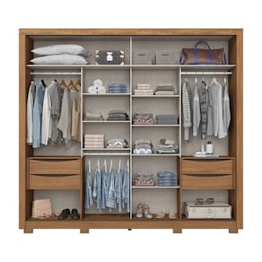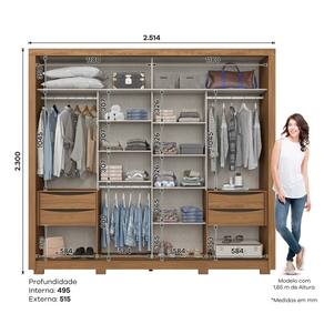 FICHA TÉCNICA: Cor Nature: Pintura UV Texturizada Fosco Cor Off White: Pintura UV Brilho Cor Preto HP: Pintura UV Textturizada Fosco Medidas Montado -A x L x P-: 230 x 250 x 51,5 Cm Peso Montado: 157 Kg Pintura UV Texturizada Cor Interna: Trama -Bege Acinzantado- Fosco Material do Fundo: MDF Possui Espaço para Vestidos Longos: Não Possui Maleiro: Sim Possui porta Objetos: Não Qtd. Portas: 2 Und. Tipo Porta: Correr Material da Porta: MDP Tipo de Dobradiça: Metálica Tipo de Puxador da Porta: Externo Material do Puxador Porta: Alumínio Qtd. Gavetas: 4 Und. Material da Gaveta: MDF/MDP Tipo de Gaveta: Interna Material da Corrediça: Metálica Telescópica Peso Máximo por Gaveta: 3 Kg Possui Organizador de Gaveta: Não Qtd. Prateleiras: 8 Und. Material da Prateleira: MDP Peso Máximo por Prateleira: 8 Kg Qtd de Pés: 9 Und. Material dos Pés: ABS Altura Pés/Rodapés: 5 cm Pés Reguláveis: Não Possui Espelho: Não Possui Vidro: Não Produto Suporta até -Kg-: 76 Kg Material Principal: MDP