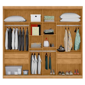 Feito em MDF 15mm.Possui 4 gavetas com corrediças telescópicas, 2 Portas deslizantes, 6 prateleiras e 4 cabideiro.
