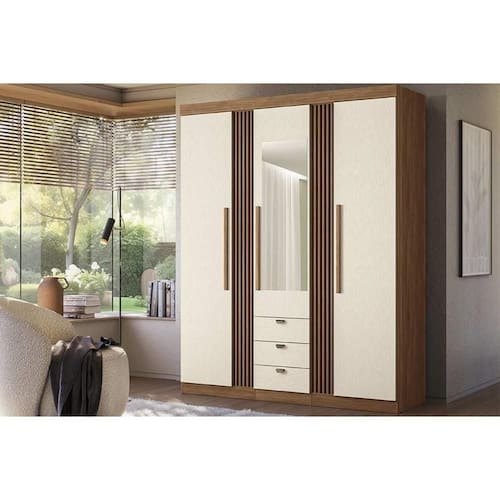 Material do Calceiro - Calceiro Metálico Tipo de Cabideiro - Aéreo Material dos Cabideiros - Cabideira Metálico Tipo de Porta do Guarda-Roupa - Portas de Bater Material das Portas - Portas em MDP Tipo de Dobradiças - Dobradiças Metálicas Diferenciais das Portas - Portas Ripadas Quantidade de Portas - 3 Portas de Abrir Quantidade de Portas com Espelho - 1 Porta com Espelho Tipo de Espelho - Espelho Externo Quantidade de Espelhos - 1 Espelho Material das Gavetas - Gavetas em MDP Tipo de Corrediça - c/ Corrediças Telescópicas Quantidade de Gavetas - 3 Material de Estrutura Fundo Gaveta - Em HDF Material das Prateleiras - Prateleiras em MDP Quantidade de Prateleiras - 5