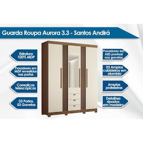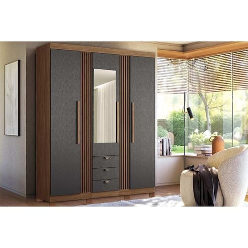 Guarda Roupa Solteiro 3 Portas (1 c/ Espelho) e 3 Gavetas c/ Pés Aurora 3.3 Jatobá/Grafite - Santos Andirá