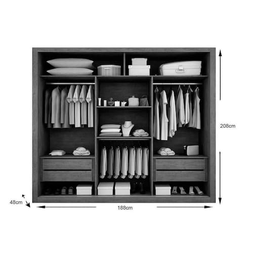 Quantidade de Portas - 3 Portas de Correr Tipo de Corrediça - c/ Corrediças Metálicas Quantidade de Gavetas - 4 Gavetas Quantidade de Prateleiras - 4