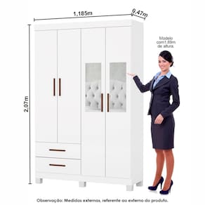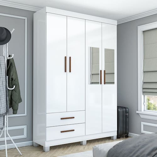 O Guarda-Roupa Genova 4 Portas 2 Gavetas Com Espelho e Pés, é ideal para quem procura um produto compacto e funcional. Possui 2,07m de altura, 1,185m de largura e 0,47m de profundidade combinado com 2 gavetas, 2 prateleiras e um grande cabideiro, deixando o produto com uma ótima divisão interna. O maleiro é ideal para guardar malas, cobertores, edredons. O cabideiro além de resistente, é ideal para pendurar pares de blusas, camisas acessórios. As prateleiras são perfeitas para colocar roupas como blusas, shorts, regatas, kits de maquiagem, toalhas, caixinhas com acessórios e bolsas menores. As gavetas fixadas sobre corrediças metálicas, são ideais para guardas blusas dobradas, shorts, malhas e roupas íntimas. Estrutura do produto em MDP.