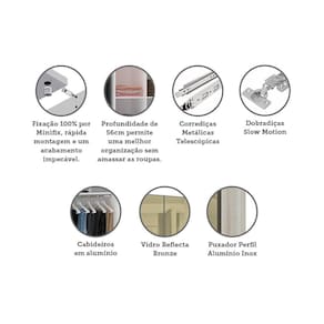 O Guarda Roupa Modulado Prime foi desenvolvido se adequando a vários espaços, de grandes a pequenos. Possui 236 cm de altura oferece divisórias para atender diversas necessidades, profundidade de 56cm possibilitando acomodar roupas sem amassar. Produzido em MDP de 15mm, dobradiças Slowmotin reforçadas em 35mm, corrediças telescópicas, a montagem é inteira por minifix que proporciona um acabamento impecável e fundos embutidos com perfil usinado para melhor acabamento e maior resistência.