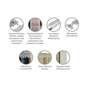 O Guarda Roupa Modulado Prime foi desenvolvido se adequando a vários espaços, de grandes a pequenos. Possui 236 cm de altura oferece divisórias para atender diversas necessidades, profundidade de 56cm possibilitando acomodar roupas sem amassar. Produzido em MDP de 15mm, dobradiças Slowmotin reforçadas em 35mm, corrediças telescópicas, a montagem é inteira por minifix que proporciona um acabamento impecável e fundos embutidos com perfil usinado para melhor acabamento e maior resistência.