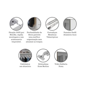 O Guarda Roupa Modulado Prime foi desenvolvido se adequando a vários espaços, de grandes a pequenos. Possui 236 cm de altura oferece divisórias para atender diversas necessidades, profundidade de 56cm possibilitando acomodar roupas sem amassar. Produzido em MDP de 15mm, dobradiças Slowmotin reforçadas em 35mm, corrediças telescópicas, a montagem é inteira por minifix que proporciona um acabamento impecável e fundos embutidos com perfil usinado para melhor acabamento e maior resistência.