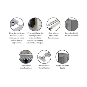 O Guarda Roupa Modulado Prime foi desenvolvido se adequando a vários espaços, de grandes a pequenos. Possui 236 cm de altura oferece divisórias para atender diversas necessidades, profundidade de 56cm possibilitando acomodar roupas sem amassar. Produzido em MDP de 15mm, dobradiças Slowmotin reforçadas em 35mm, corrediças telescópicas, a montagem é inteira por minifix que proporciona um acabamento impecável e fundos embutidos com perfil usinado para melhor acabamento e maior resistência.