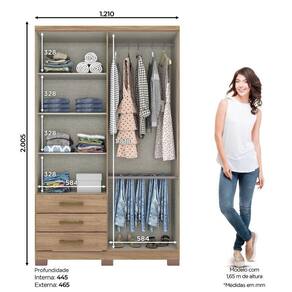 FICHA TECNICA: Cor Interna: Nas versoes Off White, Jequitiba Brilho e Castanho e Trama, na versao Branco e Trama Branco. Acabamento: Nas versoes Off White, Jequitiba Brilho e Branco a Pintura e UV e na versao Castanho a Pintura e UV Texturizada Escala de Brilho: Nas versoes Branco e Off White e Brilho e na versao Castanho HP e Fosco. Material Principal: MDF Qtd. Gavetas: 3 Und Peso Maximo por Gaveta: Cada gaveta suporta ate 3 Kg, a carga deve ser distribuida uniformemente. Material do Puxador Gaveta: ABS Material da Corredica: Metalica Simples Material da Gaveta: MDP Qtd. Portas: 4 Und Material das Portas: MDP Material da Dobradica: Metalica Material do Puxador Porta: ABS Tipo Porta: Bater Qtd. Prateleiras: 3 Und Peso Maximo por Prateleira: A Prateleira suporta ate 8 Kg, a carga deve ser distribuida uniformemente. Material da Prateleira: MDP Qtd. Pes: 6 Und Pes Regulaveis: Nao Possui Material Pes: ABS Altura Pes/Rodapes: 5 Cm Possui Rodizios: Nao Possui Produto Suporta ate (Kg): 65 Kg Possui Vidro: Nao Possui Possui Espelho: Nao Possui Possui Espaco para Vestidos Longos: Sim Possui Iluminacao: Nao Possui Ganchos: Nao Medidas Montado: (A x L x P) 200 x 121 x 46,5 Cm Peso Montado: 68 Kg
