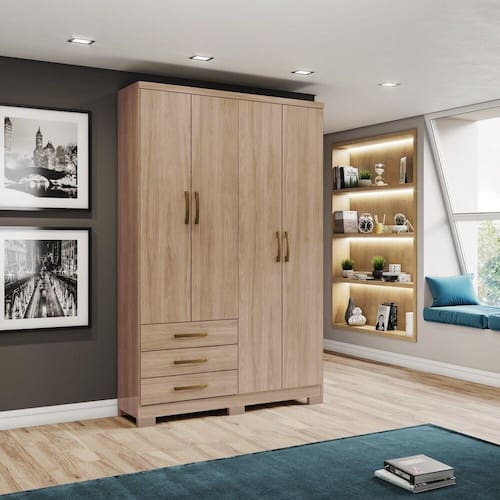 Guarda-roupa Caju 4 portas foi desenvolvido para oferecer praticidade no seu dia a dia, proporcionando muito mais comodidade na hora de organizar suas roupas, com 3 gavetas na parte externa para organização de peças menores, com corrediças metálicas que permite um deslize mais seguro e suave. Ideal para ambientes com pouco espaço. Produzido em MDP, interno no padrão Trama, que imita tecido, proporcionando mais aconchego ao ambiente. Cabideiros resistentes para organização das roupas pendurados. Os puxadores são de ABS cromado. Complemente seu quarto com bom gosto e qualidade.