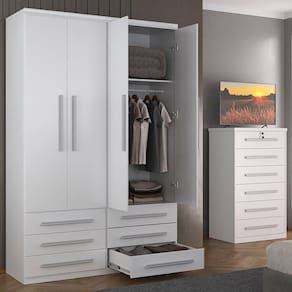 * Imagens meramente ilustrativas. Guarda-roupas Modular de 4 portas e 6 gavetas com maleiro interno, cabideiro para roupas, corrediças telescópicas e dobradiças metálicas. Junte quantos armários quiser e componha a gosto seu armário modulado com mais portas. Se voce quiser, pode montar eles separados ou unir depois. - Maleiro interno espaçoso; - Cabideiro em alumínio; - Gavetas amplas; - Puxadores grandes e resistentes. - Corrediças telescópicas. - Ótima profundidade para camisetas, jaquetas e casacos. DIMENSÕES DO PRODUTO MONTADO: ALTURA 223 CM LARGURA 146 CM PROFUNDIDADE 51 CM Manual de montagem disponível no site, será enviado junto ao produto e também esta disponivel no Youtube. Atenção: Não nos responsabilizamos, no ato da entrega, por desmontagens, subir escadas/elevadores ou transporte por guincho para apartamentos. Eventuais despesas são de responsabilidade do cliente. Confira as dimensões deste produto e certifique-se de que o mesmo passará normalmente por supostos elevadores, portas, escadas e/ou corredores de sua moradia.