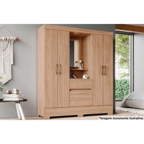 Material do Calceiro - Calceiro de Madeira Tipo de Cabideiro - Aéreo Material dos Cabideiros - Cabideiro de Madeira Tipo de Porta do Guarda-Roupa - Portas de Bater Material das Portas - Portas em MDP Tipo de Dobradiças - Dobradiças Metálicas Quantidade de Portas - 4 Portas de Abrir Tipo de Espelho - Espelho Interno Quantidade de Espelhos - 1 Espelho Material das Gavetas - Gavetas em MDP Quantidade de Gavetas - 2 Gavetas Tipo dos Pés - Pés em ABS Quantidade de Pés - 6 pés Material das Prateleiras - Prateleiras em MDP Quantidade de Prateleiras - 3 Quantidade de Nichos - 2 Nichos