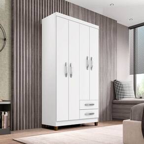Com 2 gavetas e 4 portas, este guarda-roupas oferece amplo espaço de armazenamento para roupas, acessórios e objetos pessoais. As prateleiras suportam até 5 kg, enquanto as gavetas podem suportar até 3 kg cada. Além disso, ele possui 1 cabideiro em metal e 6 puxadores que complementam seu design moderno.