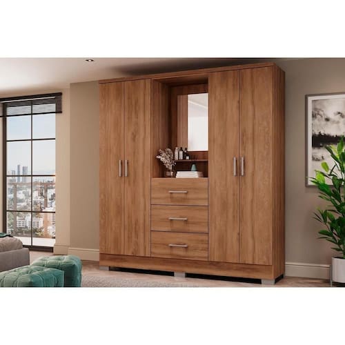 Material do Calceiro - Calceiro Metálico Tipo de Cabideiro - Aéreo Material dos Cabideiros - Cabideira Metálico Tipo de Porta do Guarda-Roupa - Portas de Correr Material das Portas - Portas em MDP Diferenciais das Portas - Portas com Detalhe Ripado Quantidade de Portas - 4 Portas de Abrir Tipo de Espelho - Espelho Interno Quantidade de Espelhos - 1 Espelho Material das Gavetas - Gavetas em MDP Tipo de Corrediça - c/ Corrediças Telescópicas Quantidade de Gavetas - 3 Tipo dos Pés - ABS/PVC Quantidade de Pés - 6 pés Material das Prateleiras - Prateleiras em MDP Diferenciais das Prateleiras - Prateleira Removível Quantidade de Prateleiras - 11 Quantidade de Nichos - 2 Nichos