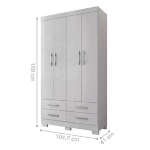 MATERIAL PRINCIPAL: MDP | QUANTIDADE DE GAVETAS: 4 | PESO DO PRODUTO (KG): 61 | PESO PRODUTO COM EMBALAGEM (KG): 62 | GARANTIA DO FABRICANTE: 3 | QUANTIDADE DE PORTAS: 4 | POSSUI ESPELHOS: Não | CORES DO PRODUTO (FILTRO DE CORES): Branco | QUANTIDADES DE CAIXAS DE EMBALAGEM: 2 | COR PREDOMINANTE: Branco | LARGURA DO PRODUTO (CM): 104 | LARGURA PRODUTO COM EMBALAGEM (CM): 55 | ESTADO DE ORIGEM: PR | TIPO DE GUARDA ROUPA: Solteiro | ALTURA DO PRODUTO COM EMBALAGEM (CM): 170 | COMPRIMENTO PRODUTO COM EMBALAGEM (CM): 187 | DESCRIÇÃO DO TAMANHO: 189x104x41 cm | PRODUTO: Guarda Roupa | ALTURA DO PRODUTO (CM): 189 | COMPRIMENTO DO PRODUTO (CM): 41 | INSTRUÇÕES/CUIDADOS: Limpar com pano macio e seco, não utilizar produtos abrasivos | CONTEÚDO DA EMBALAGEM: 1 Guarda Roupa | ESTILO: Solteiro | MATERIAL PARA FILTRO: MDP | PRODUTO PRECISA DE MONTAGEM?: Sugerimos a contratação de um montador para a montagem do produto. Não nos responsabilizamos por causadas no ato da montagem.