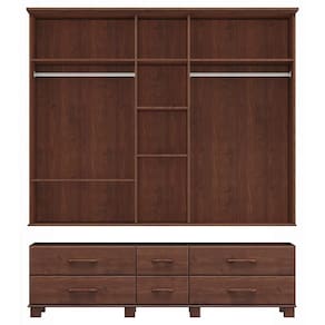 Guarda-roupa Bipartido produzido em madeira maciça de pinus de reflorestamento, garantindo durabilidade e resistência, uma peça sofisticada e funcional, perfeita para manter tudo organizado com estilo. Pintura acetinada com verniz PU e UV, proporcionando beleza e proteção extra, possuindo 05 portas, sendo 01 central com espelho, equipadas com dobradiças com amortecimento, proporcionando fechamento sem impactos, além de 06 gavetas com corrediças telescópicas, permitindo abertura total e deslizamento suave e silencioso. Conta com 06 prateleiras internas e 02 cabideiros em alumínio, ideal para roupas e acessórios, puxadores e pés em madeira maciça, garantindo um toque refinado e elegante. Este móvel chegará em sua casa separado em 04 volumes.