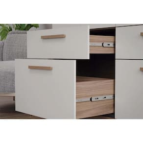 CARACTERÍSTICAS DE MÓVEIS Tipo de Estrutura do Móvel - 100% MDF Tipo de Pintura - UV Tipo de Acabamento da Pintura - Semi Brilho Tipo de puxador - MDF Quantidade de Prateleiras - 3 Prateleiras Quantidade de Gavetas - 3 Diferenciais da Gaveta - c/ Corrediças Telescópicas Quantidade de Portas - 4 Portas de Abrir Garantia - 3 meses
