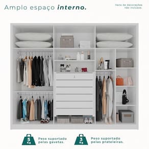 O Guarda-Roupa Anápolis Ripado 100% MDF Valverde Móveis, possui acabamento texturizado, moderno, encontrado apenas nas melhores fábricas de Minas. Este produto possui um contexto de conforto, qualidade e satisfação que atraem até os clientes mais exigentes, é um móvel conceitual e imponente, ele impressiona por sua grandiosidade, pelos espaços bem distribuídos e os detalhes pensados para atender à várias necessidades do usuário, são eles: puxadores em MDF alongados com design moderno e funcional, portas com dobradiças slow 35 mm, cabideiros e calceiro metálicos, nichos central para acessórios, sapateiras e espaço para longos, gavetas com corrediças telescópicas e uma gaveta cofre com chave, para acomodar os seus pertences e proporcionar a melhor organização do espaço e segurança. Acabamento da Prateleira: Pintura Texturizada UV Escala de Brilho da Prateleira: Fosco Possui Cabideiros: 03 Acabamento da Gaveta: Pintura Texturizada UV Possui Organizador de Gaveta: Não Acabamento da Porta: Pintura Texturizada UV Escala de Brilho da Porta: Fosco Ambiente Principal: Quarto Complexidade da Montagem: Alta: deve ser montado por um montador especializado Cor: Branco Neve Cor do Produto: Branco Neve Escala de Brilho: Fosco Informações Complementares: Porta com Ripado Itens Inclusos: 1 Guarda Roupa, kit ferragens e manual de montagem Linha ou Coleção: Anápolis Manual de Montagem e Instalação: https://cdn2.madeiramadeira.com.br/atributo/valverde/2375699-3528-17272109919741.pdf Material da Gaveta: MDF Material da Porta: MDF Material da Prateleira: MDF Material Principal: MDF modular: Não Montagem Flex: Sim, o cliente tem a opção de montar o interno de 2 formas. Necessita Montagem: Sim Origem do Produto: Nacional Peso: 225,5 kg Peso Máximo por Gaveta: 5 kg Peso Máximo por Prateleira: 3 kg Possui Calceiros: Não Possui Espelho: Não Possui Pés: Não Possui Portas: Sim Possui Prateleiras: Sim Recomendações de Uso, Manutenção e Limpeza: Pano levemente umedecido e pano seco. Não utilizar produtos de limpeza abrasivos. Sistema de Montagem: Parafusos, Cavilhas, Dobradiças e Puxadores. Tipo de Corrediça da Gaveta: Metálica Telescópica Tipo de Dobradiça/Corrediça da Porta: Metálica Tipo de Gaveta: Interna Tipo de Guarda-Roupa: Casal Tipo de Puxador da Gaveta: Não Possui Tipo de Puxador da Porta: Externo