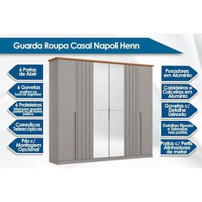 Tipo de Cabideiro - Aéreo Material dos Cabideiros - Cabideira Metálico Tipo de Dobradiças - Dobradiças Metálicas Diferenciais das Portas - Portas Ripadas - Porta c/ Espelho Quantidade de Portas - 6 Portas de Abrir Tipo de Corrediça - c/ Corrediças Telescópicas Quantidade de Gavetas - 6 Gavetas Diferenciais das Gavetas - c/ Detalhe Usinado Quantidade de Prateleiras - 6 Quantidade de Nichos - 3 Nichos