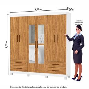 O Guarda-Roupa Genova 6 Portas 4 Gavetas com Espelhos e Pés, é ideal para quem procura um produto compacto e funcional. Possui 2,07m de altura, 1,77m de largura e 0,47m de profundidade combinado com 4 gavetas, 4 prateleiras e um grande cabideiro, deixando o produto com uma ótima divisão interna. O maleiro é ideal para guardar malas, cobertores, edredons. O cabideiro além de resistente, é ideal para pendurar pares de blusas, camisas acessórios. As prateleiras são perfeitas para colocar roupas como blusas, shorts, regatas, kits de maquiagem, toalhas, caixinhas com acessórios e bolsas menores. As gavetas fixadas sobre corrediças metálicas, são ideais para guardas blusas dobradas, shorts, malhas e roupas íntimas. Estrutura do produto em MDP.