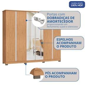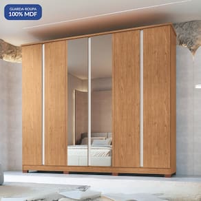 Guarda-Roupa 6 portas Zeus 100% MDF com espelho, com acabamento sofisticado e portas com ângulo de 45º, que trazem um visual moderno e maior resistência. Suas dobradiças com amortecedor garantem um fechamento suave, enquanto as corrediças telescópicas de extração total facilitam o acesso e a organização. O amplo espaço interno, com divisão ele e ela, atende às necessidades de todos, oferecendo praticidade e estilo para seu ambiente. Ideal para quem busca qualidade e funcionalidade. Acabamento da Prateleira: Pintura UV Escala de Brilho da Prateleira: Semi-Fosco Acabamento da Gaveta: Pintura UV Possui Organizador de Gaveta: Não Acabamento da Porta: Pintura UV Escala de Brilho da Porta: Semi-Fosco Altura do Espelho: 108,3 cm Altura dos Pés: 5 cm Altura Máxima dos Pés: 5.0000 Ambiente Principal: Quarto codigo_ean: 7900288105844 Complexidade da Montagem: Média: pode ser montado por mais de uma pessoa e/ou necessite de maior conhecimento para montagem Cor: Cedro Cor do Produto: Cedro Cor Interna: Cedro Escala de Brilho: Semi-Fosco Espessura da Estrutura (mm): 15 mm Espessura das Portas (mm): 15 mm Espessura das Prateleiras (mm): 15 mm Espessura do Espelho: 3 mm Espessura do Fundo (mm): 3 mm Espessura do Fundo das Gavetas (mm): 3 mm Formato do Espelho: Retangular Itens Inclusos: 1 Guarda Roupa + 1 Manual de Montagem + 1 Kit ferragens Largura do Espelho: 38,2 cm Linha ou Coleção: Quarto Manual de Montagem e Instalação: https://product-hub-prd.madeiramadeira.com.br/980498/documents/2f10643e-89f8-4c57-83f7-da37cf3ebdab27348855314174161066844.pdf Marca: Móveis Castro Material da Gaveta: MDF Material da Porta: MDF Material da Prateleira: MDF Material dos Pés: Plástico Material Principal: MDF modular: Não Necessita Montagem: Sim Origem do Produto: Nacional Peso: 244,25 kg Peso Máximo por Gaveta: 4 kg Peso Máximo por Prateleira: 8 kg Possui Calceiros: Não Possui Espelho: Sim Possui Pés: 08 Possui Portas: Sim Possui Prateleiras: Sim Produto Montado: Sim Quantidade de Cabideiros: 02 Cabideiros Quantidade de Espelho: 04 Espelhos com Tamanhos Iguais Quantidade de Portas com Espelhos: 2 Portas com Espelho Recomendações de Uso, Manutenção e Limpeza: Limpar com pano levemente umedecido Sistema de Montagem: Parafuso/Minifix/Cavilha. Tipo de Corrediça da Gaveta: Metálica Telescópica Tipo de Dobradiça/Corrediça da Porta: Aço Tipo de Fixação do Espelho: Fita Dupla Face Tipo de Gaveta: Interna Tipo de Guarda-Roupa: Casal Tipo de Puxador da Gaveta: Não Possui Tipo de Puxador da Porta: Embutido