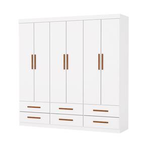 Caracteristicas do guarda roupa: • 6 portas, oferecendo máxima organização e presença imponente.• 6 gavetas espaçosas, ideais para peças dobradas e acessórios.• 2 cabideiros internos, garantindo praticidade e melhor aproveitamento vertical. 2 Prateleiras bem distribuidas Produzido em MDP Gavetas com deslizamentos suaves