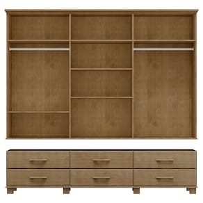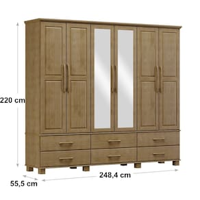 Características: Estrutura 100% em Madeira Maciça de Pinus Pintura Acetinada Verniz PU e UV Amplo espaço para armazenamento 06 Gavetas com Corrediças Telescópicas 06 Portas Dobradiças com amortecimento Portas Centrais Possuem Espelho Cabideiro em alumínio Prateleiras Internas Puxadores e Pés em Madeira Maciça Peso Máximo Suportado pelas Gavetas 05kg Distribuídos Peso Máximo Suportado pelas Prateleiras 10kg Distribuídos Peso Máximo Suportado pelo Cabideiro 08kg Distribuídos Isolamento de Peças com Manta de Polietileno Expandido (Isomanta)