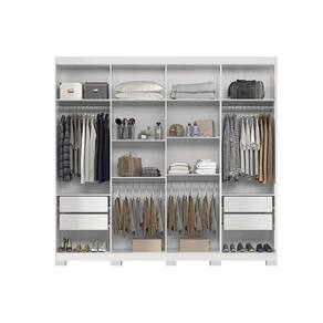 Material do Calceiro - Calceiro Metálico Tipo de Cabideiro - Aéreo Material dos Cabideiros - Cabideira Metálico Tipo de Porta do Guarda-Roupa - Portas de Bater Material das Portas - Portas em MDP Tipo de Dobradiças - Dobradiças Metálicas Diferenciais das Portas - Porta c/ Espelho Quantidade de Portas - 8 Portas de Abrir Quantidade de Portas com Espelho - 2 Portas com Espelho Tipo de Espelho - Espelho Externo Quantidade de Espelhos - 4 Espelhos Material das Gavetas - Gavetas em MDP Tipo de Corrediça - c/ Corrediças Telescópicas Quantidade de Gavetas - 4 Gavetas Tipo dos Pés - ABS/PVC Material das Prateleiras - Prateleiras em MDP Quantidade de Prateleiras - 10 Quantidade de Nichos - 2 Nichos
