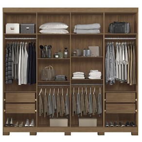 Possui divisão interna ideal para compor um quarto de casal, pois possui espaço certo para Ele e também para Ela. Com 04 amplas gavetas que deslizam suavemente sobre corrediças telescópica. 10 amplas prateleiras para acomodar as roupas que precisam ser dobradas, caixas, sapatos, decoração, etc. 04 cabideiros/calceiros em alumínio para pendurar as roupas com organização. Sem falar em seu design moderno com puxadores em MDF revestido, proporcionando um design mais charmoso e muito mais beleza. O acabamento na cor madeirada é com a tecnologia REVERSE (acabamento com textura semi brilho), sendo fabricado de forma sustentável, dentro dos padrões de preservação do