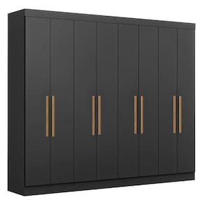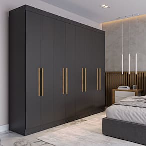 Com 8 portas de abrir e amplo espaço interno, o modelo oferece excelente organização com gavetas internas com corrediças metálicas, varão e calceiro em madeira. Sua modulação interna versátil permite acomodar desde roupas longas até acessórios, adaptando-se perfeitamente às suas necessidades.