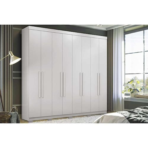 Material do Calceiro - Calceiro Metálico Tipo de Cabideiro - Aéreo Material dos Cabideiros - Cabideira Metálico Tipo de Porta do Guarda-Roupa - Portas de Bater Material das Portas - Portas em MDP Tipo de Dobradiças - Dobradiças Metálicas Quantidade de Portas - 8 Portas de Abrir Material das Gavetas - Gavetas em MDP Tipo de Corrediça - c/ Corrediças Telescópicas Quantidade de Gavetas - 4 Gavetas Tipo dos Pés - ABS/PVC Material das Prateleiras - Prateleiras em MDP Quantidade de Prateleiras - 10 Quantidade de Nichos - 2 Nichos