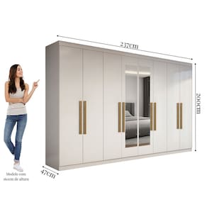 Com 8 portas de bater e amplo espaço interno, o modelo oferece excelente organização com gavetas internas, corrediças telescópicas, varão e calceiro em madeira. Sua modulação interna versátil permite acomodar desde roupas longas até acessórios, adaptando-se perfeitamente às suas necessidades.