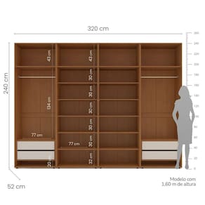 O Guarda-Roupa Luna 8 Portas com Maleiro oferece organização máxima com design moderno e acabamento de alta qualidade. Com 320 cm de largura, 240 cm de altura e 52 cm de profundidade, ele possui espaço interno amplo e bem distribuído, contando com 10 prateleiras, 2 cabideiros, 4 gavetas e 4 maleiros, acomodando roupas, calçados e acessórios com facilidade. As portas têm puxadores em MDF, garantindo resistência, ergonomia e um visual mais elegante. Seu acabamento em pintura UV proporciona maior durabilidade e proteção contra desgaste, mantendo o móvel bonito por mais tempo. Parte da linha modular Luna, esse modelo combina excelente aproveitamento de espaço, funcionalidade e estilo contemporâneo, sendo ideal para quem busca um guarda-roupa completo, resistente e sofisticado. Acabamento da Prateleira: Pintura UV Escala de Brilho da Prateleira: Semi-Fosco Possui Cabideiros: Sim Acabamento da Gaveta: Pintura UV Possui Organizador de Gaveta: Não Acabamento da Porta: Pintura UV Escala de Brilho da Porta: Semi-Fosco Material do Puxador da Porta: MDF Ambiente Principal: Quarto codigo_ean: 7900288291325 Complexidade da Montagem: Alta: deve ser montado por um montador especializado Cor: Freijó/Creme Cor da Porta: Off White Cor do Produto: Freijó/Creme Cor Interna: Freijó Escala de Brilho: Semi-Fosco Espessura da Estrutura (mm): 15 mm Espessura das Portas (mm): 15 mm Espessura das Prateleiras (mm): 15 mm Espessura do Fundo (mm): 3 mm Espessura do Fundo das Gavetas (mm): 3 mm Itens Inclusos: 1 Guarda-Roupa, Kit Ferragens, Manual de Montagem e Termo de Garantia Linha ou Coleção: Luna Manual de Montagem e Instalação: https://product-hub-prd.madeiramadeira.com.br/575606789/documents/dbf91236-a17d-4a5d-8154-5011dc92235c333538062241764937882707.pdf Marca: Politorno Material da Gaveta: MDF/MDP Material da Porta: MDF/MDP Material da Prateleira: MDF/MDP Material Principal: MDF/MDP modular: Sim Necessita Montagem: Sim O Módulo Pode ser utilizado individualmente: Sim Origem do Produto: Nacional Peso: 183,86 kg Peso Máximo por Gaveta: 5 kg Peso Máximo por Prateleira: 10 kg Possui Calceiros: Não Possui Espelho: Não Possui Pés: Não Possui Portas: Sim Possui Prateleiras: Sim Produto Montado: Sim Quantidade de Cabideiros: 02 Cabideiros Quantidade de Gavetas: 04 Gavetas Recomendações de Uso, Manutenção e Limpeza: Utilize um pano macio umedecido com água e sabão neutro, seguido de pano seco. Não utilize produtos químicos ou abrasivos para limpeza, pois estes danificam o revestimento do móvel. Sistema de Montagem: Cavilha, Parafuso, Minifix e prego. Tipo de Corrediça da Gaveta: Metálica Telescópica Tipo de Dobradiça/Corrediça da Porta: Alumínio Tipo de Gaveta: Interna Tipo de Guarda-Roupa: Casal Tipo de Puxador da Gaveta: Embutido Tipo de Puxador da Porta: Externo Marca: Não Informado