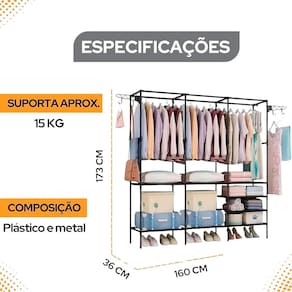 • Informações Adicionais: O armário portátil tem muito espaço para você armazenar muitos itens. Dividido em prateleiras, seção de cabides, bolsos laterais, fácil de usar.