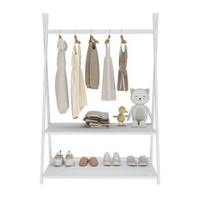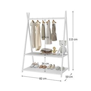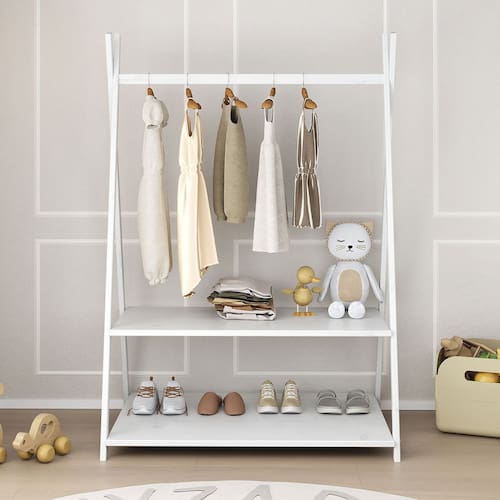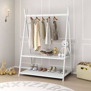O cabideiro tem altura acessível para pendurar roupinhas com facilidade, e as duas prateleiras permitem organizar sapatos, brinquedos e objetos do dia a dia.