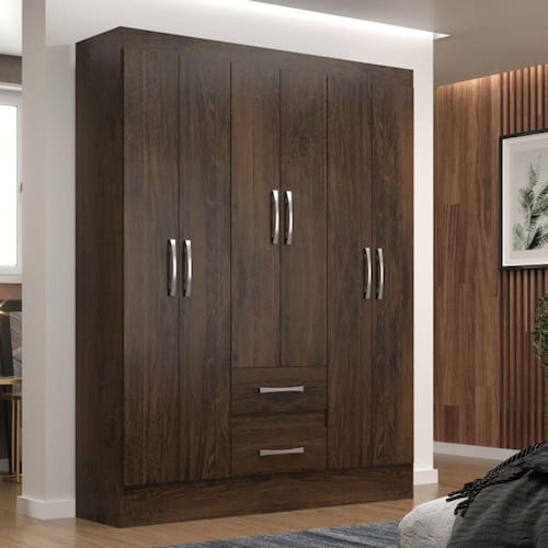 - Tonalidade: Marron - Material do Puxador: Plástico - Observação: Objetos decorativos que aparecem nas imagens, não acompanham o produto. - Recomendação de Limpeza: Usar pano levemente umedecido seguido de pano seco. - Como os Móveis Chegarão na Minha Casa: Desmontados, em caixas, com manual de montagem e todos os acessórios para a montagem. - Dificuldade de Montagem?: Baixo - Sistema de Montagem: Parafusos e Cavilhas - Revestimento?: Pintura UV - Quantidade de Nichos?: 5 - Possui Prateleiras?: Possui - Possui Cabideiros?: Possui - Possui Pés?: Não Possui - Escala de Brilho: Fosco - Peso Suportado nas Gavetas (Kg): 3 - Peso Suportado nas Prateleiras (Kg): 7 - Material das Dobradiças: Metal - Material das Corrediças: Metal - Tipo de Guarda Roupa: Casal - Tipo de Porta: Porta de Bater - Necessita Montagem?: Sim - Possui Espelho?: Não - Possui vidro?: Não - Quantidade de Gavetas: 2 - Quantidade de Portas: 6 - Garantia: 3 meses - Modelo: Casal