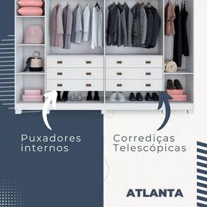 Todo mundo busca um dormitorio completo e organizado, o guarda-roupa Atlanta foi projetado para proporcionar praticidade e funcionalidade no uso diario, com materias prima de qualidade e de ultima geracao. Todo o projeto foi pensado para embelezar seu quarto com muita praticidade no uso e muita qualidade e durabilidade no dia a dia.