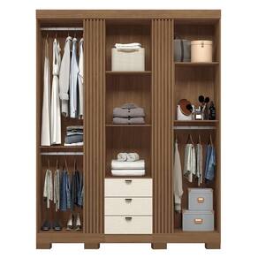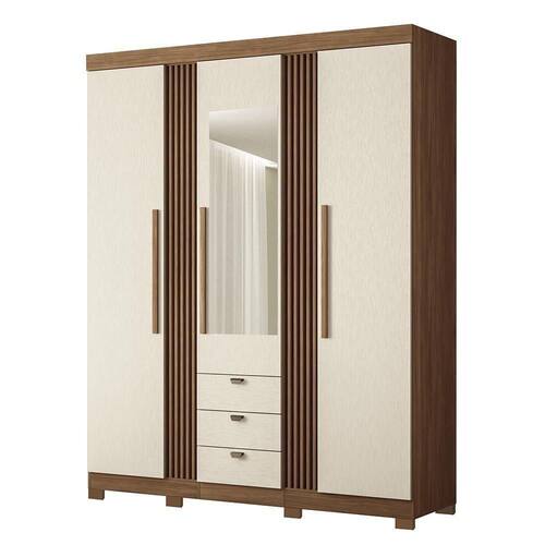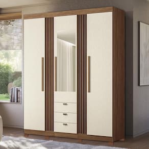 Guarda Roupa Aurora Ripado 3 Portas E 3 Gavetas Jatobá/areia Com Espelho E Pés - Santos Andirá Jatobá/areia Guarda Roupa Aurora Ripado 3 Portas e 3 Gavetas com Espelho e Pés - Santos Andirá O Guarda-Roupa Aurora é o auge da elegância e praticidade. Com 3 portas largas que se abrem amplamente, este móvel é sinônimo de qualidade superior e design sofisticado. Ideal para quem busca funcionalidade sem abrir mão do estilo, conta com 3 gavetas externas deslizantes suavemente com puxadores pontuais em ABS para um toque moderno, e portas com puxadores revestidos em MDF para um acabamento impecável. O charme incomparável deste guarda-roupa está nas suas vistas externas com efeito ripado, seguindo as últimas tendências de design. E para surpreender ainda mais, inclui uma meia lateral falsa para guardar seus itens mais preciosos com . Com um acabamento externo de alto padrão, aplicado com tecnologia REVERSE para um toque levemente texturizado em semi fosco, o Guarda-Roupa Aurora é a escolha perfeita para quem busca o melhor em móveis. ESPECIFICAÇÕES: - Estrutura em MDP - Pintura UV - Acabamento Reverse - 3 Portas - Dobradiças metálicas - Puxadores em MDF revestidos nas portas - 3 Gavetas externas - Corrediças telescópicas - Puxadores pontuais em ABS nas gavetas - 3 Cabideiros em alumínio - Vistas externas com efeito ripado - Prateleiras - Aplicação de espelho - Amplo espaço interno - Pés em PVC