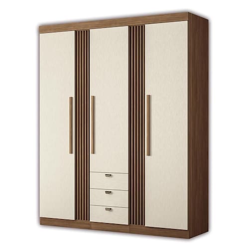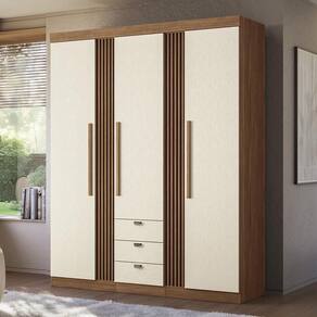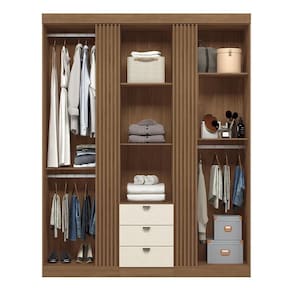 Guarda Roupa Aurora Ripado 3 Portas E 3 Gavetas Jatobá/areia - Santos Andirá Jatobá/areia Guarda Roupa Aurora Ripado 3 Portas e 3 Gavetas - Santos Andirá O Guarda-Roupa Aurora é o auge da elegância e praticidade. Com 3 portas largas que se abrem amplamente, este móvel é sinônimo de qualidade superior e design sofisticado. Ideal para quem busca funcionalidade sem abrir mão do estilo, conta com 3 gavetas externas deslizantes suavemente com puxadores pontuais em ABS para um toque moderno, e portas com puxadores revestidos em MDF para um acabamento impecável. O charme incomparável deste guarda-roupa está nas suas vistas externas com efeito ripado, seguindo as últimas tendências de design. E para surpreender ainda mais, inclui uma meia lateral falsa para guardar seus itens mais preciosos com . Com um acabamento externo de alto padrão, aplicado com tecnologia REVERSE para um toque levemente texturizado em semi fosco, o Guarda-Roupa Aurora é a escolha perfeita para quem busca o melhor em móveis. ESPECIFICAÇÕES: - Estrutura em MDP - Pintura UV - Acabamento Reverse - 3 Portas - Dobradiças metálicas - Puxadores em MDF revestidos nas portas - 3 Gavetas externas - Corrediças telescópicas - Puxadores pontuais em ABS nas gavetas - 3 Cabideiros em alumínio - Vistas externas com efeito ripado - Prateleiras - Amplo espaço interno