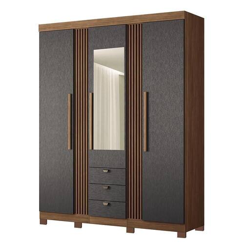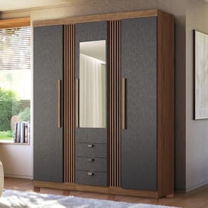 Guarda Roupa Aurora Ripado 3 Portas E 3 Gavetas Jatobá/grafite Com Espelho E Pés - Santos Andirá Jatobá/grafite Guarda Roupa Aurora Ripado 3 Portas e 3 Gavetas com Espelho e Pés - Santos Andirá O Guarda-Roupa Aurora é o auge da elegância e praticidade. Com 3 portas largas que se abrem amplamente, este móvel é sinônimo de qualidade superior e design sofisticado. Ideal para quem busca funcionalidade sem abrir mão do estilo, conta com 3 gavetas externas deslizantes suavemente com puxadores pontuais em ABS para um toque moderno, e portas com puxadores revestidos em MDF para um acabamento impecável. O charme incomparável deste guarda-roupa está nas suas vistas externas com efeito ripado, seguindo as últimas tendências de design. E para surpreender ainda mais, inclui uma meia lateral falsa para guardar seus itens mais preciosos com . Com um acabamento externo de alto padrão, aplicado com tecnologia REVERSE para um toque levemente texturizado em semi fosco, o Guarda-Roupa Aurora é a escolha perfeita para quem busca o melhor em móveis. ESPECIFICAÇÕES: - Estrutura em MDP - Pintura UV - Acabamento Reverse - 3 Portas - Dobradiças metálicas - Puxadores em MDF revestidos nas portas - 3 Gavetas externas - Corrediças telescópicas - Puxadores pontuais em ABS nas gavetas - 3 Cabideiros em alumínio - Vistas externas com efeito ripado - Prateleiras - Aplicação de espelho - Amplo espaço interno - Pés em PVC