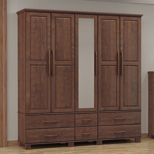 Características: Estrutura 100% em Madeira Maciça de Pinus Pintura Acetinada Verniz PU e UV Amplo espaço para armazenamento 06 Gavetas com Corrediças Telescópicas 05 Portas Dobradiças com amortecimento Porta Central Possue Espelho Cabideiro em alumínio Prateleiras Internas Puxadores e Pés em Madeira Maciça Peso Máximo Suportado pelas Gavetas 05kg Distribuídos Peso Máximo Suportado pelas Prateleiras 10kg Distribuídos Peso Máximo Suportado pelo Cabideiro 08kg Distribuídos Isolamento de Peças com Manta de Polietileno Expandido (Isomanta)