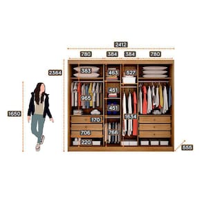 100 MDF, colunado em 25mm, interno ele e ela, trilho inferior em alumínio e roldanas com amortecedores, perfil puxador e batente alinhador em alumínio bronze, roldana superior com guia zero e freio, espaço para longo, gavetas com puxadores e corrediças telescópicas, cabideiros e calceiro em alumínio.