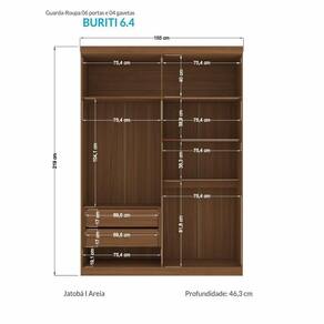 O guarda-roupa Buriti 04 portas é um guarda-roupa de casal de ótima qualidade, além do design diferenciado e atemporal que ele tem. São 4 portas, sendo 02 delas em MDF e com detalhe usinado ripado e puxadores pontuais em ABS para abertura. As demais portas em MDP seguem com puxadores em MDF revestido em formato grande. Internamente, possui 05 amplas prateleiras com muito espaço para guardar os pertences, 02 cabideiros oblongos em aluminio de excelente qualidade para pendurar as roupas, 02 gavetas com corrediças telescópicas que suportam muito mais peso, compartimento para guardar pertences de valor. Externamente, o acabamento é em textura Reverse semi-fosco, suave ao toque, e que facilita a limpeza. Todo o processo fabril está certificado na Iso 9001, excelência na qualidade dos processos. Acabamento da Prateleira: Pintura Escala de Brilho da Prateleira: Semi-Fosco Possui Cabideiros: 01 Acabamento da Gaveta: Pintura Escala de Brilho da Gaveta: Semi-Fosco Material do Puxador da Gaveta: MDP Possui Organizador de Gaveta: Não Acabamento da Porta: Pintura Escala de Brilho da Porta: Semi-Fosco Material do Puxador da Porta: MDF Ambiente Principal: Quarto codigo_ean: 7909903364420 Complexidade da Montagem: Média: pode ser montado por mais de uma pessoa e/ou necessite de maior conhecimento para montagem Cor: Jatobá/Areia Cor do Produto: Jatobá/Areia Cor Flex: não Cor Interna: Jatobá Escala de Brilho: Semi-Fosco Gaveta com Chave: Não Itens Inclusos: 1 Guarda Roupa, 1 Kit Ferragens, 1 Manual de Montagem Linha ou Coleção: Buriti Manual de Montagem e Instalação: https://product-hub-prd.madeiramadeira.com.br/861005/documents/d88f843e-6a52-4f1c-854c-fa55a2945a241420703949316grburiti04pts.pdf Material da Gaveta: MDP Material da Porta: MDF/MDP Material da Prateleira: MDP Material Principal: MDP modular: Não Montagem Flex: não Necessita Montagem: Sim Origem do Produto: Nacional Peso: 97,95 kg Peso Máximo por Gaveta: 3 kg Peso Máximo por Prateleira: 3 kg Possui Calceiros: 01 Possui Espaço para Vestidos Longos: Não Possui Espelho: Não Possui Espelho Interno: Não Possui Ganchos: Não Possui iluminação: Não Possui Nichos: Não Possui Painel de TV: Não Possui Pés: Não Possui Portas: Sim Possui Prateleiras: Sim Possui Sapateira: Não Produto Montado: Sim Quantidade de Gavetas: 02 Gavetas Quantidade de Prateleiras: 05 Prateleiras Recomendações de Uso, Manutenção e Limpeza: Pano Levemente Umedecido e Flanela Sistema de Montagem: Parafusos, Cavilhas Tipo de Corrediça da Gaveta: Metálica Telescópica Tipo de Dobradiça/Corrediça da Porta: Metálica Tipo de Gaveta: Interna Tipo de Guarda-Roupa: Casal Tipo de Puxador da Gaveta: Não Possui Tipo de Puxador da Porta: Externo