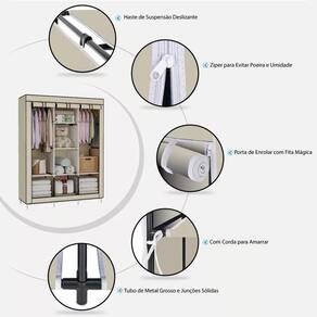 Este guarda-roupa portátil é uma excelente unidade de arrumação para manter o seu quarto limpo e arrumado. Com espaço extra para suas roupas, sapatos, livros, brinquedos e muito mais, é perfeito para qualquer quarto. Vem com uma capa de tecido não tecido que não só oferece uma ótima aparência, mas também uma maneira fabulosa de esconder qualquer bagunça feia.Características:Material Durável: Fabricado com aço durável e resina à prova de sujeira, fácil de limpar para manutenção e cuidado.Espaço Generoso: Longos espaços para pendurar permitem vestidos de noite e trajes espaciais ocasionais, enquanto as prateleiras oferecem espaços menores para roupas dobráveis, acessórios e outros itens.Instalação Fácil: Fácil montagem, não são necessárias ferramentas ou habilidades especiais, leva de 15 a 20 minutos.Capa de Enrolar: A capa de enrolar evita a entrada de poeira, mantendo suas roupas limpas e protegidas.Design Portátil: Leve e portátil, feito de estruturas de ferro forjado com coberturas de tecido não tecido, pode ser movido facilmente para os espaços necessários.Especificações:Material: MetalCapacidade de Carga: 100 quilogramasNúmero de Prateleiras: 8Tamanho: 130x45x175Os guarda-roupas dessa linha são instalados em salas lotadas, servindo como peças decorativas e também como convenientes espaços de armazenamento de emergência para compras impulsivas. Sua leveza e portabilidade garantem facilidade de movimentação conforme necessário.
