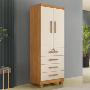 Guarda Roupa Camiseiro New Maia 2 Portas 4 Gavetas - Benetil Cinamomo Off O Guarda-Roupa New Maia com seu lindo design tras charme e elegancia a qualquer ambiente, possui 4 gavetas e 2 portas, contem chave que garante sua privacidade, com cabideiro em aluminio tem muito espaco para seus cabides, acomodando todos seus pertences, ficando muito bem-organizado. Sua fabricacao utiliza a linha mdp perffect, que une a sustentabilidade a inovacao tecnologica, proporcionando durabilidade e facil limpeza; inspirando sofisticacao ao mobiliario. Sua pintura UV conta com boa resistencia, e facil de limpar e e ecologicamente correto, pois utiliza madeira de reflorestamento, evitando o desmatamento. Caracteristicas: Material principal: MDP Espessura das chapas: 15 mm Escala de brilho: semi fosco Acabamento: Pintura UV Sistema de montagem: parafuso, cavilha e cantoneiras metalicas Quantidade de Portas: 2 Quantidade de Gavetas: 4